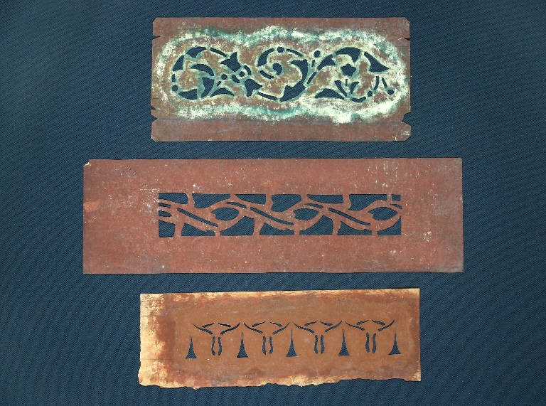 I cartoni per trasposizione, realizzati in cartoncino disegnato e ritagliato secondo un motivo decorativo, venivano utilizzati per creare decorazioni all'interno delle scenografie, consentendo di riprodurre in serie il motivo ornamentale. Le mascherine presentano dei motivi decorativi in stile liberty: la prima con volute floreali, la seconda con una greca stretta e flessuosa, la terza con due sottili moduli alternati.