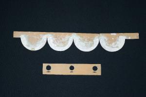 I cartoni per trasposizione, realizzati in cartoncino disegnato e ritagliato secondo un motivo decorativo, venivano utilizzati per creare decorazioni all'interno delle scenografie, consentendo di riprodurre in serie il motivo ornamentale. Le mascherine presentano dei motivi geometrici. Nella prima il cartoncino è sagomato a formare quattro semicerchi, con tracce di tempera bianca, collegati tra loro in alto da una fascia rettangolare. Nella seconda, all'interno di un rettangolo di cartoncino, sono ritagliati tre piccoli cerchi, al di sotto di ognuno è presente una piccola lunetta.