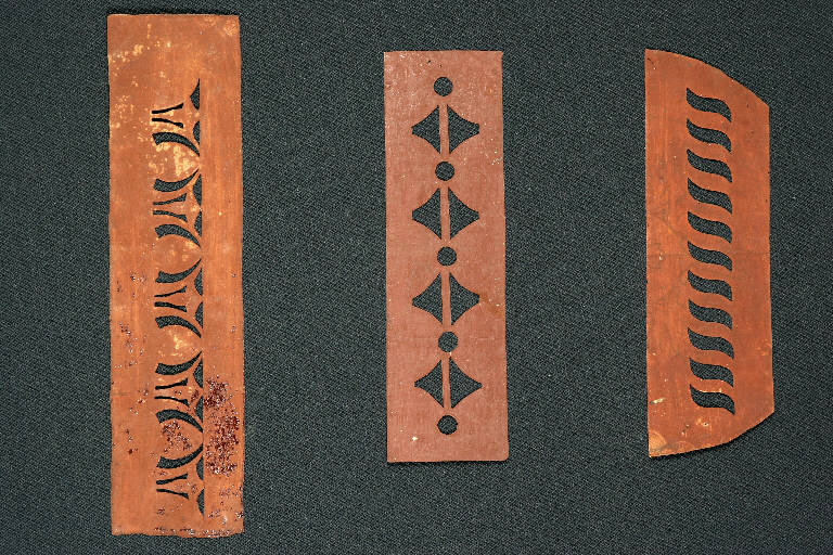 I cartoni per trasposizione, realizzati in cartoncino disegnato e ritagliato secondo un motivo decorativo, venivano utilizzati per creare decorazioni all'interno delle scenografie, consentendo di riprodurre in serie il motivo ornamentale. Le mascherine presentano delle greche formate da moduli ripetuti. La prima è composta da moduli di sottili elementi ricurvi; la seconda è composta da due file di triangoli contrapposti per la base, intervallati da piccoli cerchi; la terza da elementi a esse ripetuti.