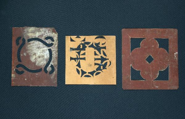 I cartoni per trasposizione, realizzati in cartoncino disegnato e ritagliato secondo un motivo decorativo, venivano utilizzati per creare decorazioni all'interno delle scenografie, consentendo di riprodurre in serie il motivo ornamentale. La prima mascherina presenta una greca di ornato a forma circolare composta da quattro segmenti curvilinei; la seconda è una greca cuoriforme composta di elementi a tre punte arrotondate intrecciati ad altri ellittici realizzata con un cartoncino con delle lettere stampate; la terza presenta un rettangolo nel quale è inscritto un elemento composto da quattro semicerchi uniti intorno ad un piccolo centro rettangolare, a formare un fiore molto stilizzato.