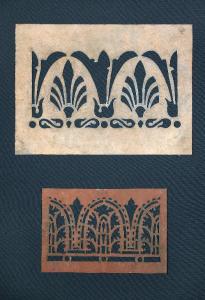 I cartoni per trasposizione, realizzati in cartoncino disegnato e ritagliato secondo un motivo decorativo, venivano utilizzati per creare decorazioni all'interno delle scenografie, consentendo di riprodurre in serie il motivo ornamentale. La prima mascherina presenta una complessa decorazione di ornato composta da un elemento simile a foglie in un vaso sotto al quale c'è un altro elemento a foglie stilizzate con una greca di elementi curvilinei intervallati da piccoli cerchi che chiude in basso la composizione. La seconda ha una complessa decorazione floreale stilizzata inscritta in una greca semiellittica intervallata in alto da un elemento a foglia; chiude in basso la composizione una semplice greca di piccoli cerchi e segmenti lineari.