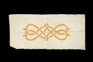 Il disegno preparatorio, su carta, presenta un motivo decorativo ornamentale ad intreccio ocra, realizzato tramite la tecnica a stencil con tempera ocra. Probabilmente si tratta di una prova prima di utilizzare questa decorazione a stencil nella realizzazione di scenografie.