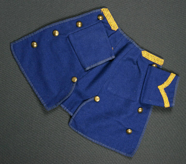 La giacca, di tipo militare, è di lana blu con fodera di cotone azzurra, bordata con traversino blu. Il bordo superiore è decorato con passamaneria oro e sulle maniche sono cuciti due galloni. Sul davanti sono applicati otto bottoni di metallo dorati ed altri due più piccoli cuciti posteriormente all'altezza della martingala.