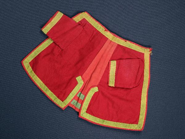 La giacca è di flanella rossa e cotone rosso come la fodera. E' composta da tre pezzi cuciti insieme, la parte centrale è di cotone rosso con fodera bianca ed è decorato in basso con due strisce di traversino verde. Tutta la giacca e le maniche sono anch'esse bordate di traversino verde.