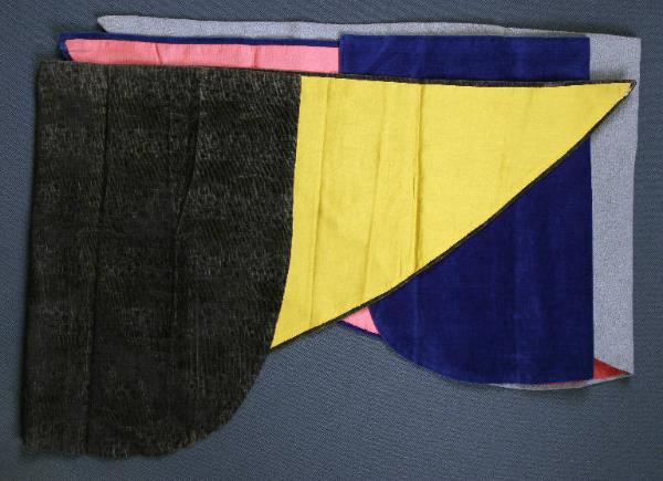 I mantelli hanno forma triangolare con un lato arrotondato. Il primo è di velluto stampato marrone con fodera di tessuto giallo, il secondo è di lana grigia con fodera rossa mentre il terzo è di velluto blu con fodera rosa.