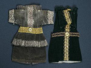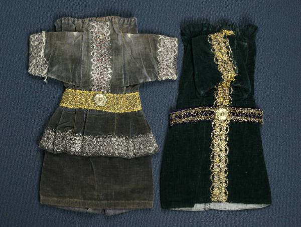 Il primo abito è di velluto verde scuro con una fodera di tessuto di canapa grigia. Sul davanti, in senso longitudinale, e ai polsi è cucita della passamaneria oro mentre in vita ha una cintura di velluto viola decorata con passamaneria oro e chiusa da un largo bottone di metallo dorato. Il secondo abito è di velluto grigio con fodera di cotone stampato a quadretti rossi, bianchi e blu. In vita è cucita una balza dello stesso velluto con l'orlo decorato con passamaneria argento, la stessa che decora il davanti ed i polsi. Alla vita è presente una cintura di laminato oro chiusa da un largo bottone di metallo dorato. Entrambi hanno, sul bordo superiore, un cordoncino per il fissaggio al burattino.