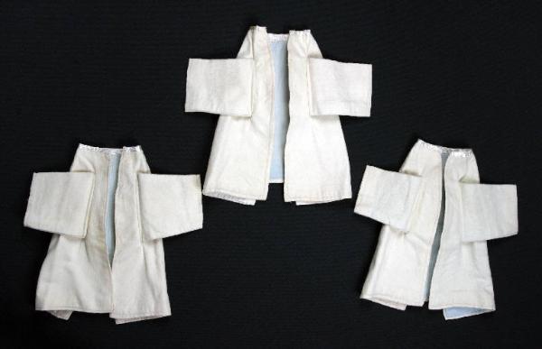 Le tre giacche sono di flanella bianca con fodera in parte bianca, con sottili righe in rilievo, e in parte azzurra di cotone. Ogni giacca è composta da tre pezzi dei quali il centrale più corto degli altri. Il collo è bordato con nastrino di raso bianco.