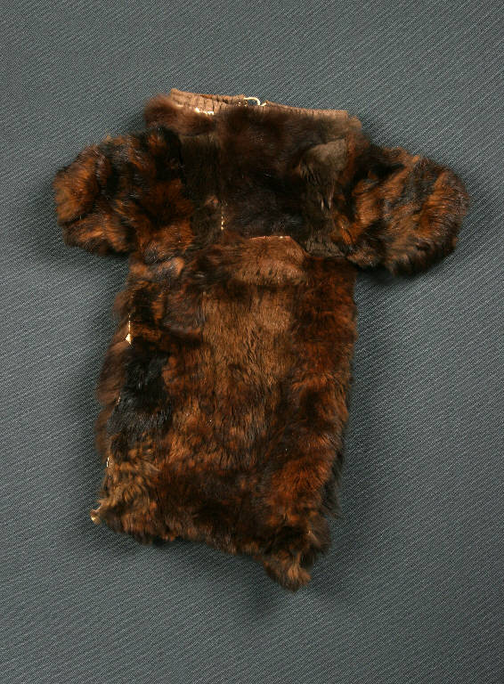 Pelliccia di lapin marrone composta da tre pezzi cuciti insieme su di una veste di tela marrone con fodera beige. Sul davanti sono cucite le maniche con le aperture chiuse da filo nero. Nel bordo superiore della veste è inserito un cordoncino per il fissaggio a coulisse.