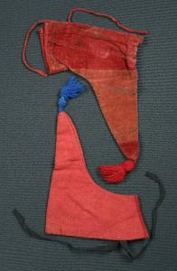 Il primo cappello, tipo cappuccio, è di flanella rossa con fodera di cotone rosso, bordato con traversino rosso; sul davanti, internamente, sono cuciti due nastri neri per il fissaggio alla testa; alla punta è cucito un fiocco di lana blu legato con filo verde. Il secondo, anch'esso con forma a cappuccio, è di velluto rosso formato da più pezzi cuciti insieme con fodera beige; sul davanti, internamente, sono cuciti due nastri rossi per il fissaggio alla testa. Alla punta è cucito un fiocco di lana rossa mentre internamente è presente un triangolo di cuoio. L'orlo è bordato con traversino rosso.