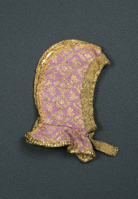 Il cappello, tipo cappuccio, è stondato e di tessuto viola laminato oro, con fodera di cotone bianco; è chiuso alla gola ed aperto posterioremente. E' bordato con passamaneria oro di diverso disegno all'orlo e ai bordi.