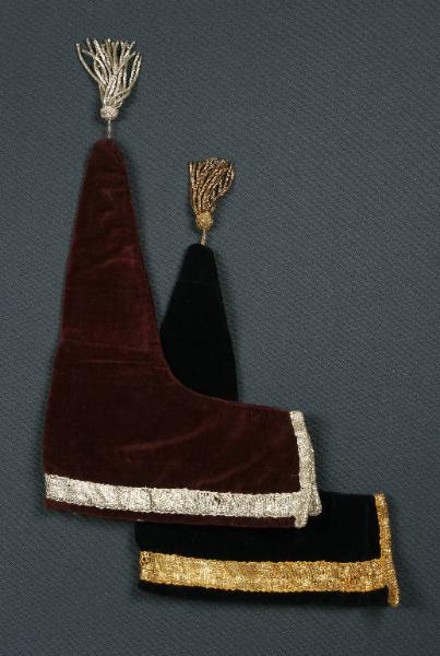 I cappelli, tipo cappucci, sono di velluto, il primo bordaux e il secondo nero, con fodera di cotone verde. Sono bordati e decorati con nastro laminato e hanno cucito un fiocco di passamaneria in punta, l'uno argento e l'altro oro.
