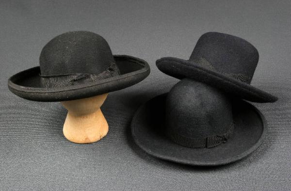 I cappelli sono a tesa larga, di feltro con bordo e con, alla base della calotta, una fascia di gros de tours in tinta. Il primo è nero, il secondo grigio e il terzo blu.