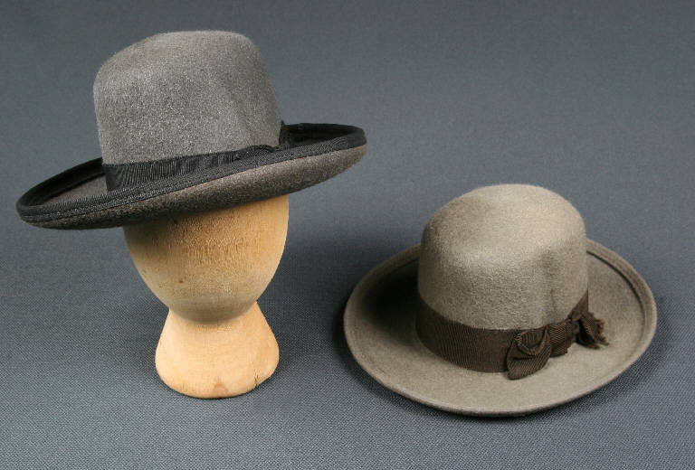 I cappelli sono di feltro con, alla base della calotta, una fascia di gros de tours. Il primo è grigio con fascia marrone, il secondo grigio con bordo e fascia in tinta.