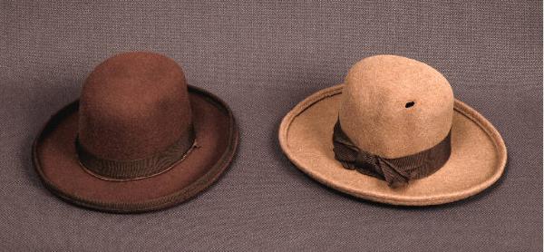 I cappelli sono di feltro marrone con bordo e con una fascia di gros de tours in tinta alla base della calotta.