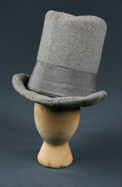 Il cappello, tipo cilindro, è di cartone rivestito di lana grigia con fascia di gros de tours in tinta.