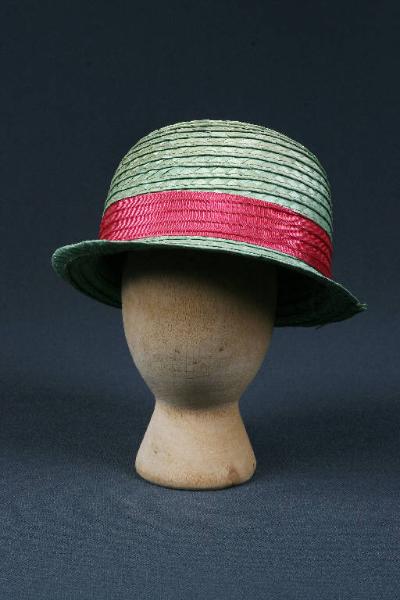 Il cappello, da donna, è di paglia verde chiaro intrecciata con una fascia di tessuto rosso cucita alla base della calotta.