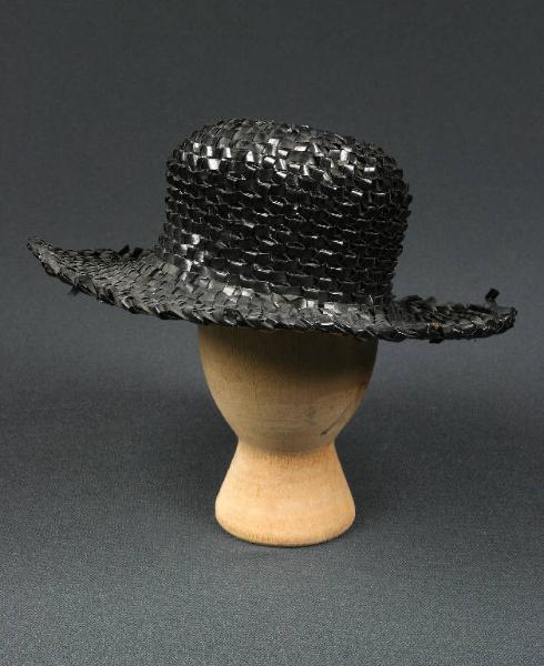 Il cappello, da donna, è di paglia nera intrecciata con falda larga.