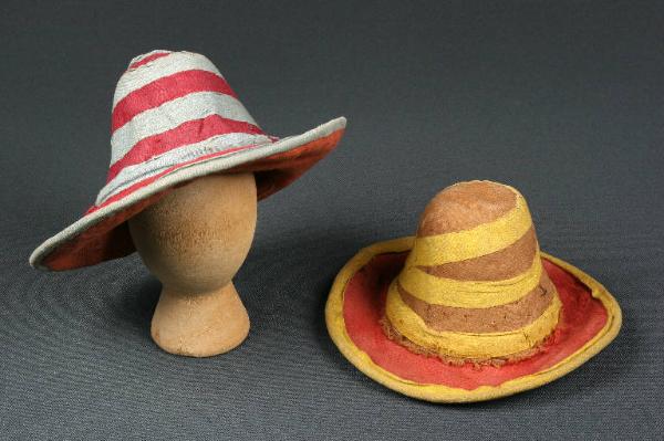 I cappelli sono da brigante. Il primo è di feltro marrone rivestito di tessuto rosso e, la parte inferiore della falda, di tessuto marrone con bordo di nastrino verde; il medesimo nastrino è cucito a spirale sulla calotta. Il secondo è di cartoncino rivestito all'interno di tessuto blu a fiorellini bianchi stampati; la parte inferiore della falda è di tessuto marrone e la parte superiore di tessuto rosso operato, bordata con nastrino giallo mentre la calotta è rivestita di tessuto marrone e decorata con nastrino giallo a spirale.