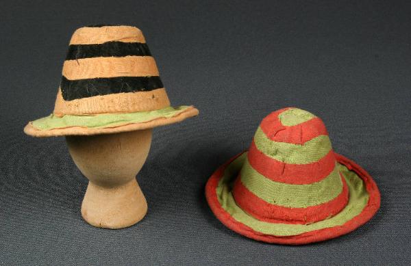 I cappelli sono da brigante. Il primo è di cartone pressato, rivestito di tessuto verde e dipinto internamente di viola; la falda è bordata con nastrino rosso che è anche cucito a spirale sulla calotta. Il secondo è di carta pressata con la falda rivestita di tessuto verde e bordata con nastrino marrone; la calotta è rivestita di velluto nero con nastrino marrone cucito a spirale.