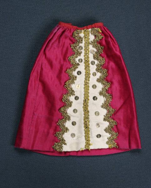 La gonna, con fodera di cotone bianco, è di seta rossa con inserto di seta avorio bordato con passamaneria oro, diviso da nastro laminato oro e decorato con paillettes oro. La vita è bordata con una cintura di tessuto rosso.