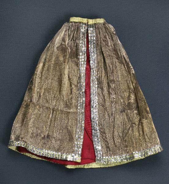 La gonna presenta, cucite insieme, una sottogonna di seta rossa e una gonna di laminato oro con bordo di nastro di seta giallo al quale sono cucite piccole paillettes argento. In vita è cucita una cintura di nastro giallo con abbottonatura anteriore chiusa da automatici di metallo neri.