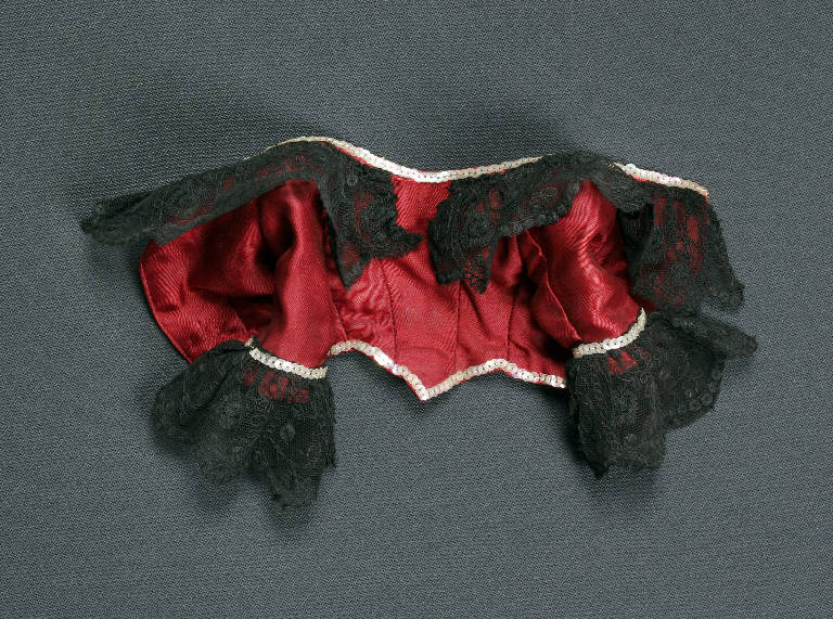 Il corpetto, di foggia rinascimentale, allacciato dietro, è di raso rosso vino, foderato di cotone viola, maniche al gomito, colletto e polsini di pizzo di cotone nero. In fondo alle maniche, alla scollatura e al bordo inferiore, tagliato a punta sul davanti, è presente un bordo di paillettes di madreperla.