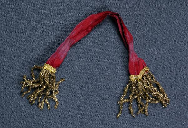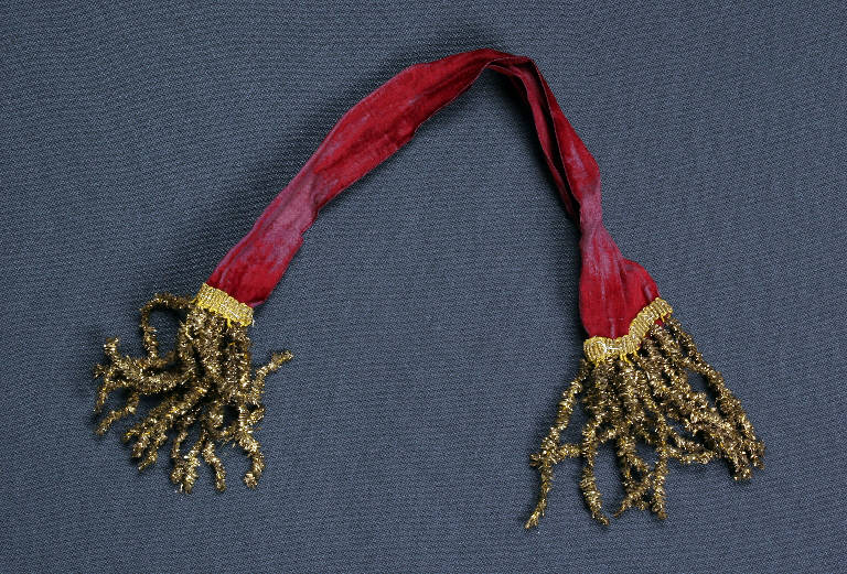 La cintura è di velluto rosso vino terminante con un'alta frangia di passamaneria dorata.