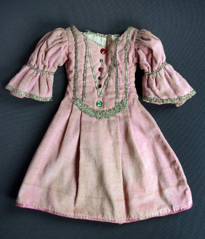L'abito, di foggia rinascimentale, è di velluto rosa, bordato sul fondo con passamaneria rosa più scuro, passamaneria argento sul davanti a segnare il corpetto e a bordare la scollatura; nel centro sono cucite una fila di sette pietre di vetro verdi e rosse a simulare delle gemme. Sono presenti maniche a sbuffo bordate di passamaneria argento, arricciate all'altezza dei gomiti con una striscia di passamaneria argento. L'abito, foderato di tela bianca, è aperto sul dietro.
