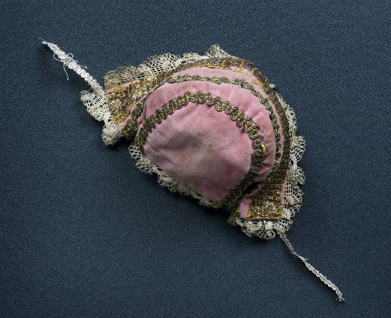 La cuffia, foderata di tela bianca, è di velluto rosa bordata di pizzo di cotone bianco, larga fascia di passamaneria oro sul davanti, e due striscie di decorazione più strette di passamaneria oro che decorano la calotta.
