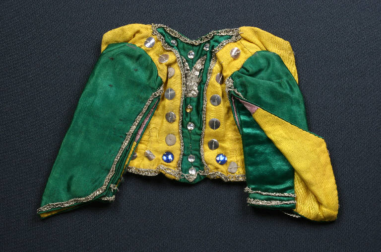 Il corpetto è di raso verde e tessuto giallo con fodera di tela bianca. E' decorato con grosse paillettes, pietre di vetro circolari blu e sfaccettate gialle e bianche, carta stagnola fissata su un cartone e bordata con piccole paillettes. Le maniche sono di raso verde, sormontate da maniche più larghe ed aperte terminanti a punta. Completa la decorazione del nastro laminato argento.