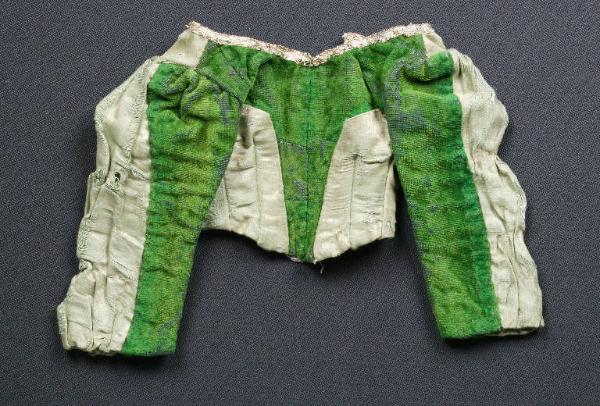 Il corpetto, foderato di tela bianca, ha le maniche di velluto verde e seta bianca, il bordo è chiuso con nastro laminato argento.