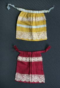 I due grembiulli sono realizzati con tessuto di colore giallo e rosso bordeaux. Entrambi hanno cucite orizzontalmente due fasce di pizzo, una delle quali più larga. Il grembiule giallo è decorato ulteriormente con due fasce di raso azzurro.