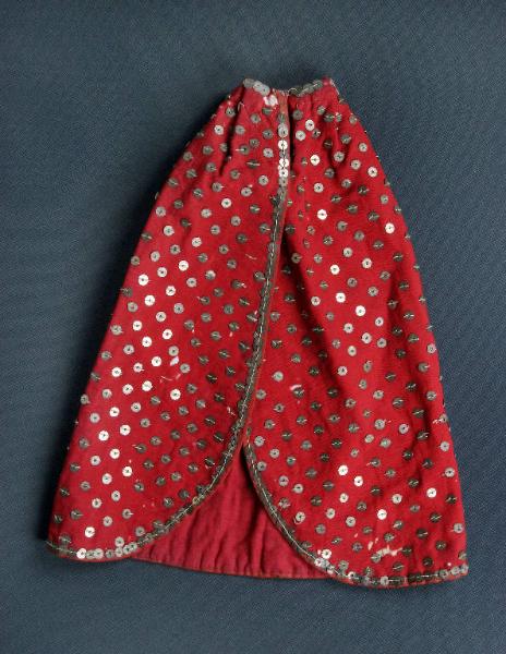 Il mantello, di tessuto rosso, è decorato con paillettes metalliche ed è bordato con traversino rosso. Presenta una leggera arricciatura al collo.