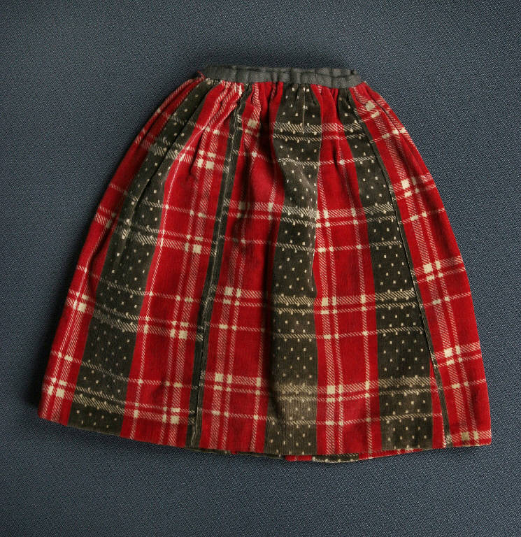 La gonna è di velluto quadrettato rosso, marrone e bianco; è foderata con tela bianca e bordata in vita con traversino marrone.