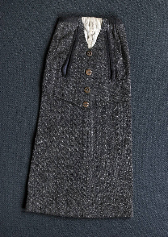 La veste è di panno di lana grigio con fodera di tessuto grigio. Sulla veste è applicato un finto panciotto della stessa stoffa con quattro bottoncini beige sul davanti, alle aperture delle braccia e del collo è presente del traversino grigio e al collo il cordoncino per il fissaggio a coulisse. Sul davanti è inserito un inserto a V dei tessuto chiaro a righine che simula la camicia.