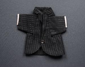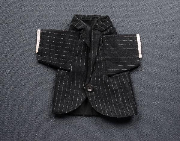 La giacca di panno di lana nera e fodera di tessuto grigio è un monopetto con collo e revers, chiuso da un bottone che maschera un automatico di metallo. Nelle maniche sono cuciti i polsini di tessuto chiaro a righine, chiusi da un automatico di metallo.