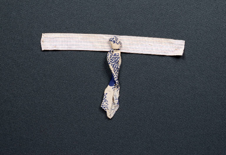 Il colletto è di tessuto chiaro a righine e vi è cucita una cravatta di seta blu a disegni floreali.