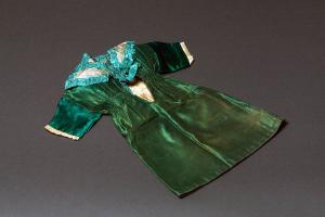 L'abito è di seta verde con fodera di tela beige; presenta un'arricciatura in vita. La manica destra è ottenuta con raso verde di diversa tonalità; ai polsi è cucita una rouche di seta beige. E' cucito un ampio collo di seta bianca con bordo di nastro verde chiaro e fiocco posteriore cuciti. Presenta l'apertura posteriore, che consentiva di vestire il burattino, bordata con nastro giallo.