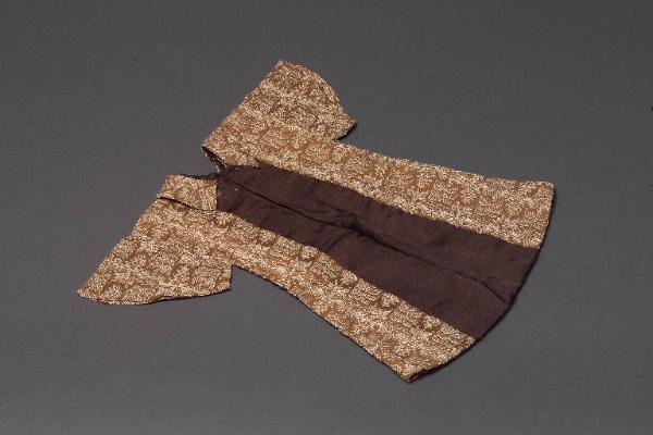 L'abito presenta maniche svasate e a punta; è di tessuto operato con filo bianco su fondo marrone con un inserto di seta marrone nella parte centrale. Presenta una fodera di tela rosa e l'orlo di seta rosa. Vi è cucito un colletto dello stesso tessuto operato dell'abito, con fodera rosa.