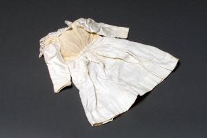 L'abito è di cotone bianco con gonna sfoderata e corpetto di seta color avorio con fodera di cotone. Presenta un colletto di pizzo, i polsi sono bordati con pizzo bianco che orna anche la vita e parte della gonna.