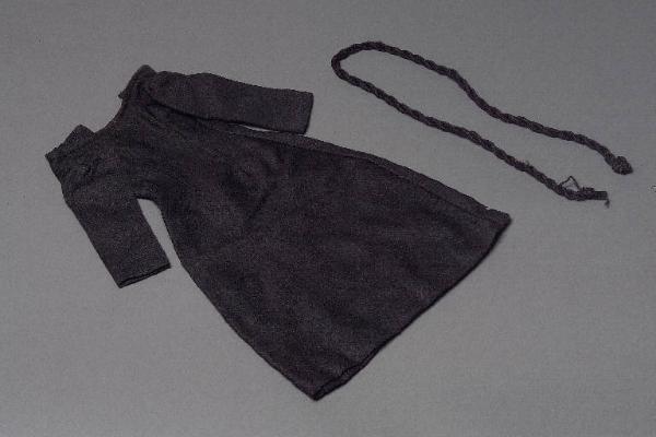 L'abito è di tessuto di lana nero con fodera di tela nera; presenta delle pences in vita e abbottonatura posteriore. E' completato da un cordone di cotone nero intrecciato che funge da cintura.