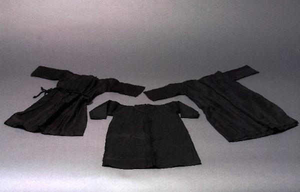 Gli abiti sono di tessuto di cotone nero sfoderato con il collo bordato di nero. Due sono completati da un cordone di cotone nero intrecciato che fonge da cintura.
