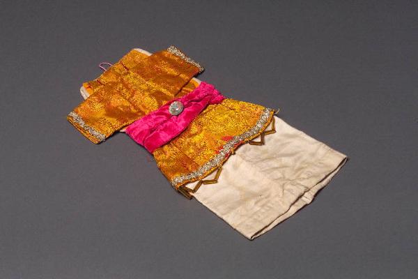 L'abito, di foggia orientale, è composto da una veste sulla quale è cucita una giacca: la veste è di seta beige; la giacca, che avvolge anche la vita, è di broccato giallo e rosso. Presenta i polsi bordati con passamaneria argento come l'orlo inferiore, al quale sono cucite canoutilles dorate. In vita è cucita una cintura di velluto fucsia con applicato un bottone di metallo e vetro sfaccettato. Nel bordo superiore è inserito un cordoncino rosa per il fissaggio a coulisse.