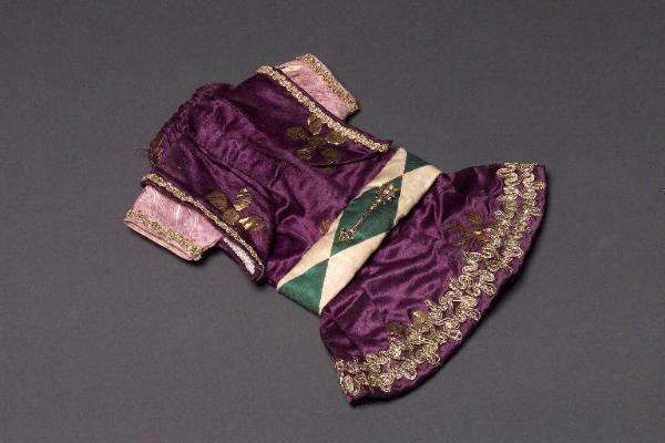 L'abito, di foggia orientale, è di seta viola con fodera di garza bianca, riccamente decorato con ricami floreali di filo dorato e con passamaneria argento. Le maniche sono larghe e terminano a punta; all'interno di esse sono applicate maniche più strette di seta lilla con bordo di passamaneria. In vita è cucita una cintura di seta bianca con rombi verdi sulla quale è cucita una decorazione di metallo a forma di freccia con piccoli vetri di strass. Nel bordo superiore è inserito un cordoncino per il fissaggio della coulisse.