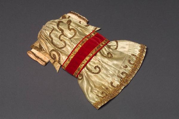 L'abito, di foggia orientale, è di seta verde chiaro con fodera di seta verde, riccamente decorato con ricami in filo dorato e passamaneria oro. Le maniche sono larghe e terminano a punta; all'interno di esse sono applicate maniche più strette di seta bianca con bordo di passamaneria. In vita è applicata una cintura di velluto rosso, bordata con passamaneria oro e decorata con una spilla di metallo con un vetro strass al centro. Nel bordo superiore è inserito un cordoncino per il fissaggio a coulisse.