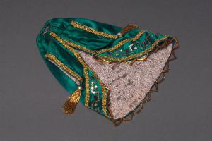 La giacca, di foggia orientale, con bordi arrotondati e fodera di tessuto grigio operato, è di raso verde con orlo decorato con canoutilles dorate. Presenta nel bordo inferiore una decorazione con passamaneria dorata che delimita una fascia nella quale sono cucite paillettes dorate e pietre sfaccettate di vetro strass rosse e bianche. Presenta maniche a punta, alle estremità delle quali è cucita una perla e una frangia di piccole canoutilles dorate.