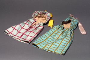 I mantelli hanno un cappuccio cucito con rouche all'orlo e grande fiocco sulla sommità, posteriormente è legato un cordoncino azzurro. Il primo è di tessuto azzurro a righe verticali e orizzontali marroni, con fodera di tela beige; sul cappuccio è applicato un grande fiocco di seta lilla. Il secondo è di tessuto azzurro a quadri bordati di rosso con fodera beige; sul cappuccio è applicato un fiocco di seta gialla.