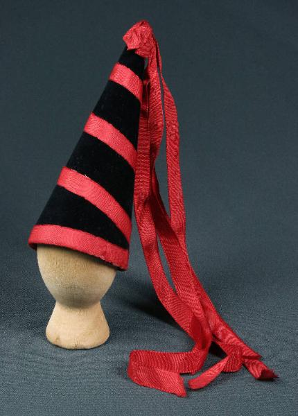 Il cappello a cono è di cartoncino marrone rivestito di velluto nero e decorato con nastrino rosso cucito a spirale e altro nastrino che decora la sommità.
