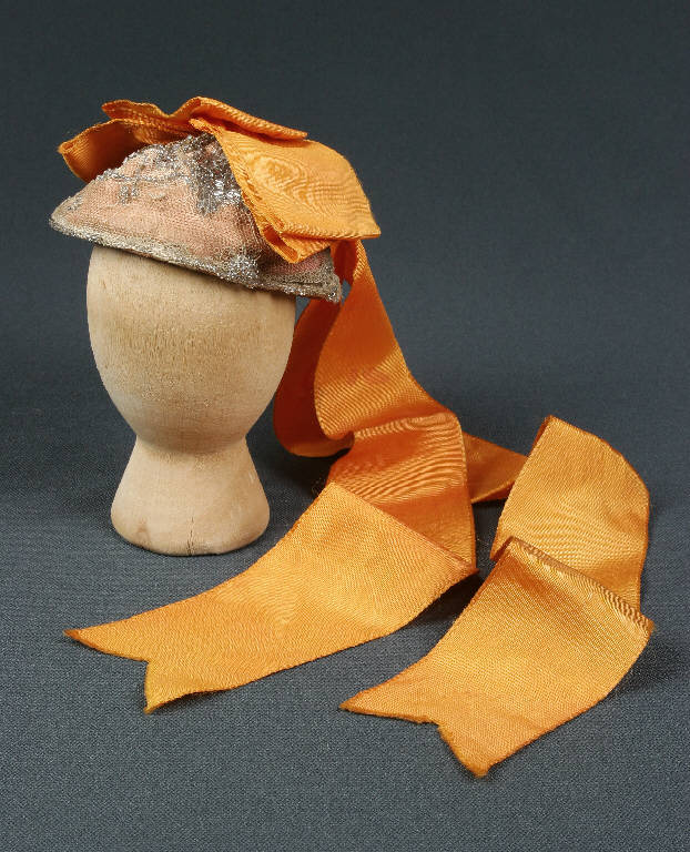 La calotta è di seta arancione ricoperta con tulle e foderata con garza; presenta una ricca decorazione con piccole canoutilles di vetro e un largo fiocco di nastro di seta arancione che cade posteriormente e termina a coda di rondine.
