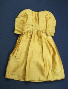 L'abito femminile, con apertura posteriore, è di cotone giallo con corpetto foderato di tela chiara a righe azzurre e gialle. Presenta un'arricciatura in vita, pences sul davanti e scollatura tonda.